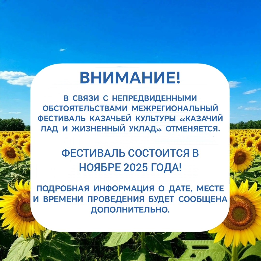 Фестиваль «Казачий лад и жизненный уклад» переносится на ноябрь 2025 года!