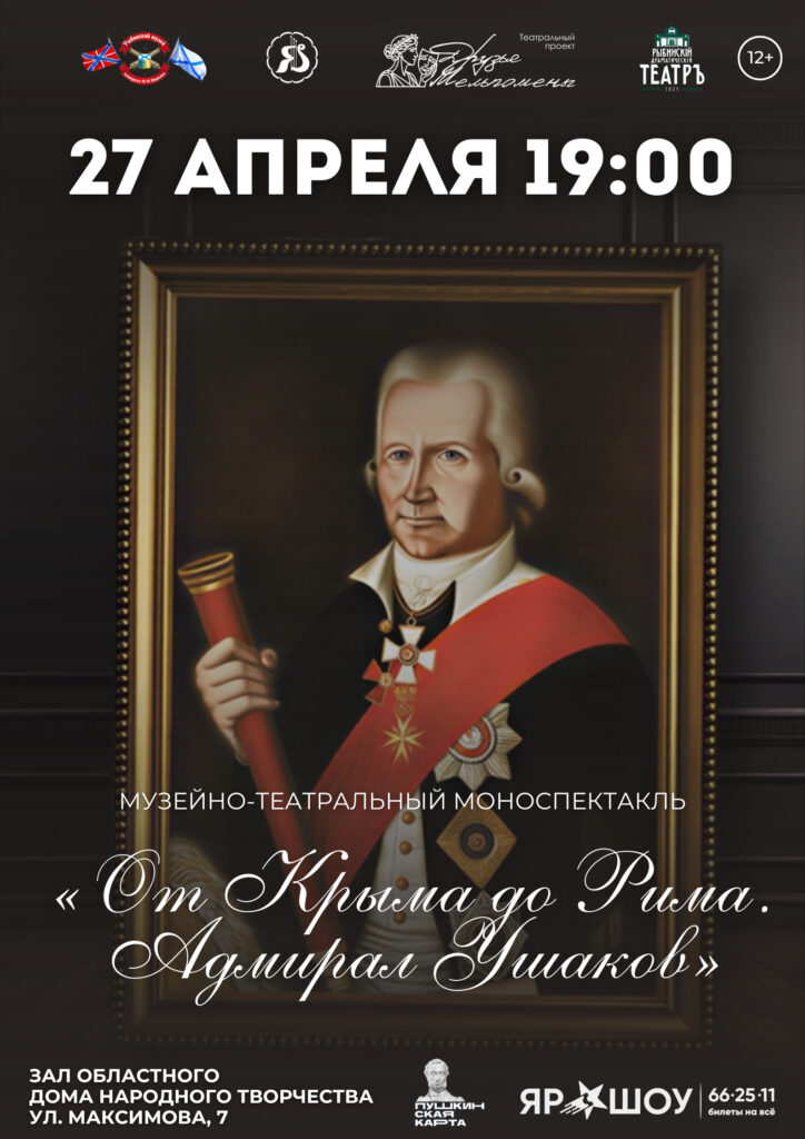 Театральный проект «Друзья Мельпомены» приглашает на спектакль «От Крыма до Рима. Адмирал Ушаков» — постановку о жизни и подвигах легендарного русского флотоводца Фёдора Фёдоровича Ушакова, адмирала, не знавшего поражений.